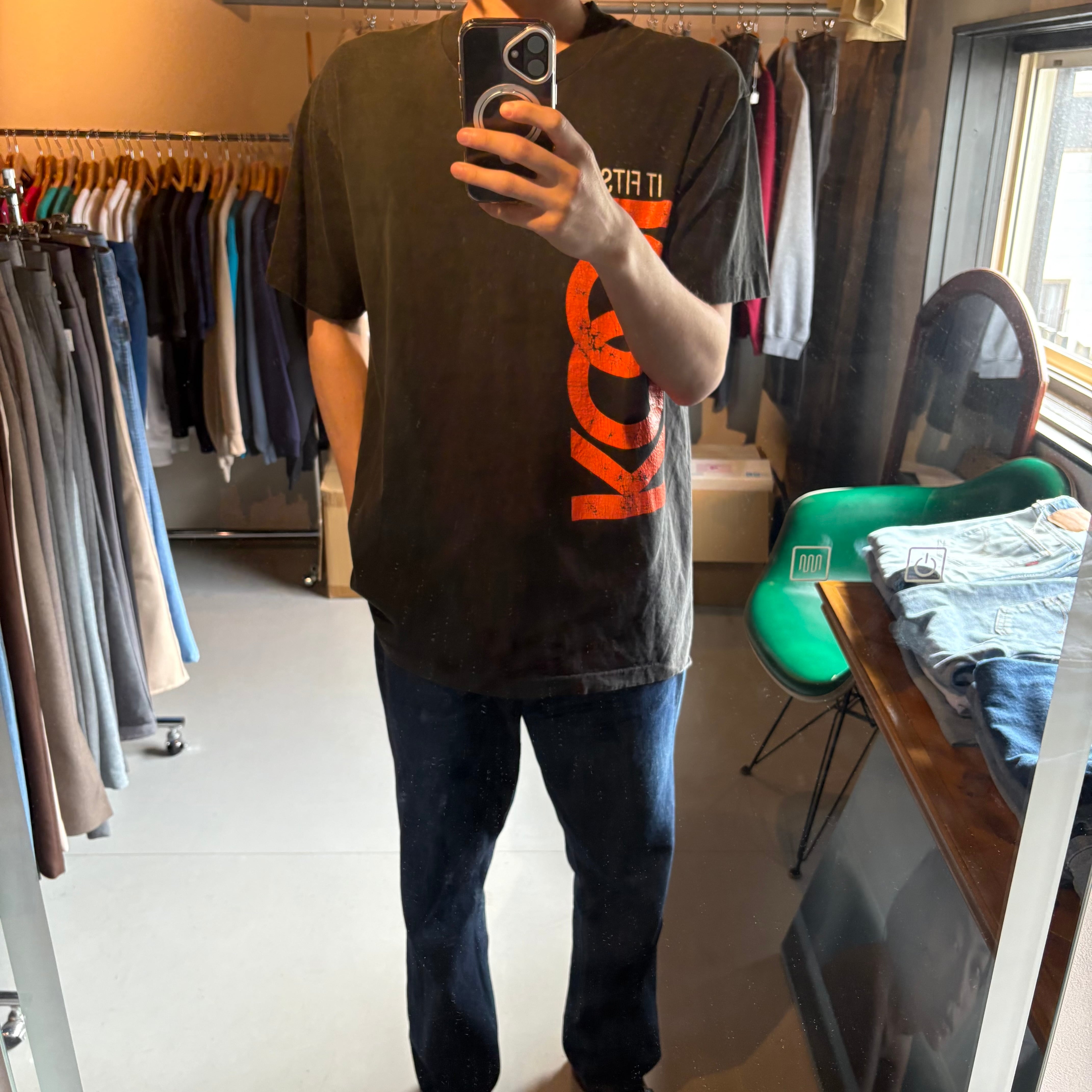 ブラックボディーにオレンジのプリントでプリントがひび割れしていてかっこいいと思います。薄いデニムなどで合わせても無難でカッコ良さそうです。