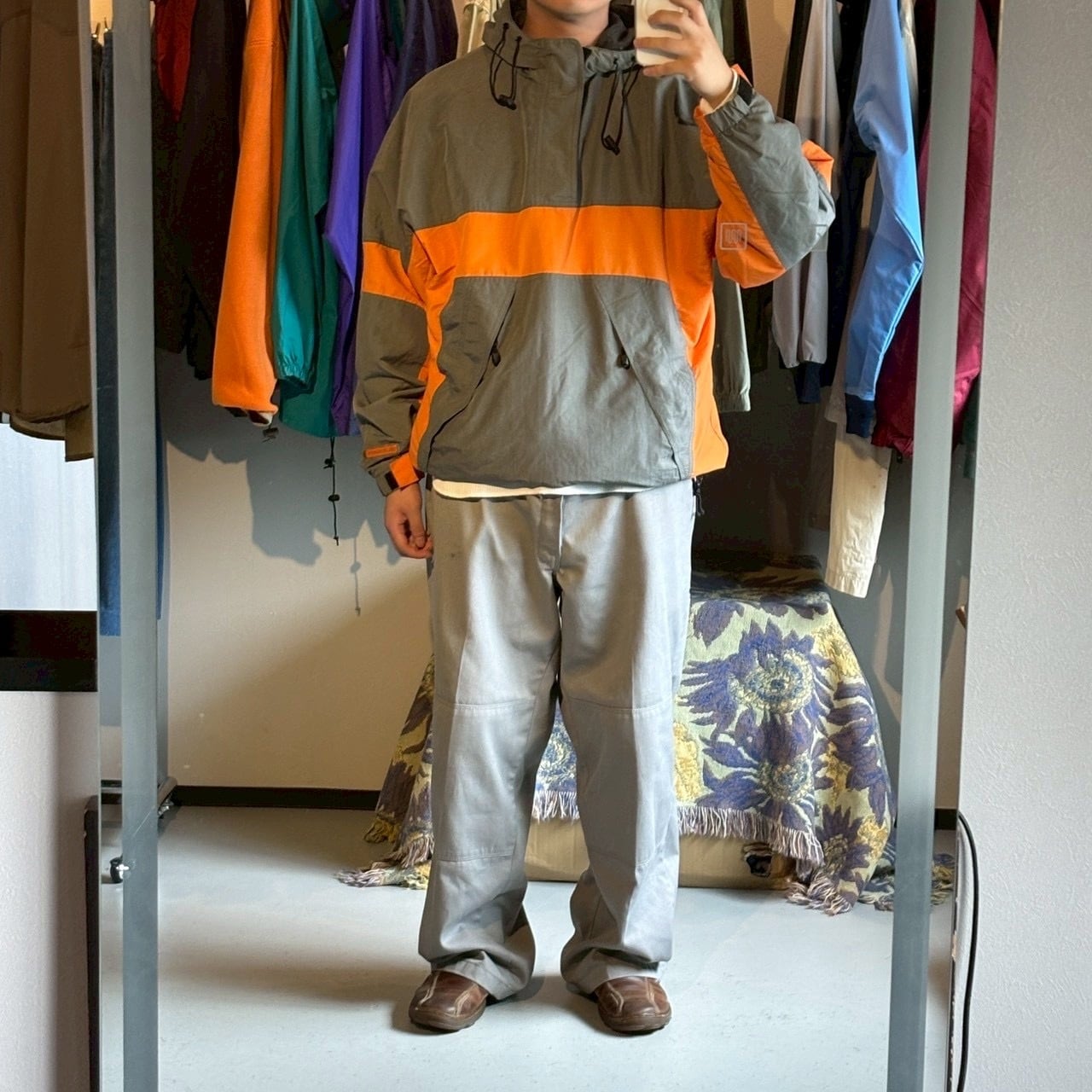 こちらのアノラックも切り替えのカラーが、オレンジ、グレー、という少しナードな2000年代感溢れるカラーリングになっています。