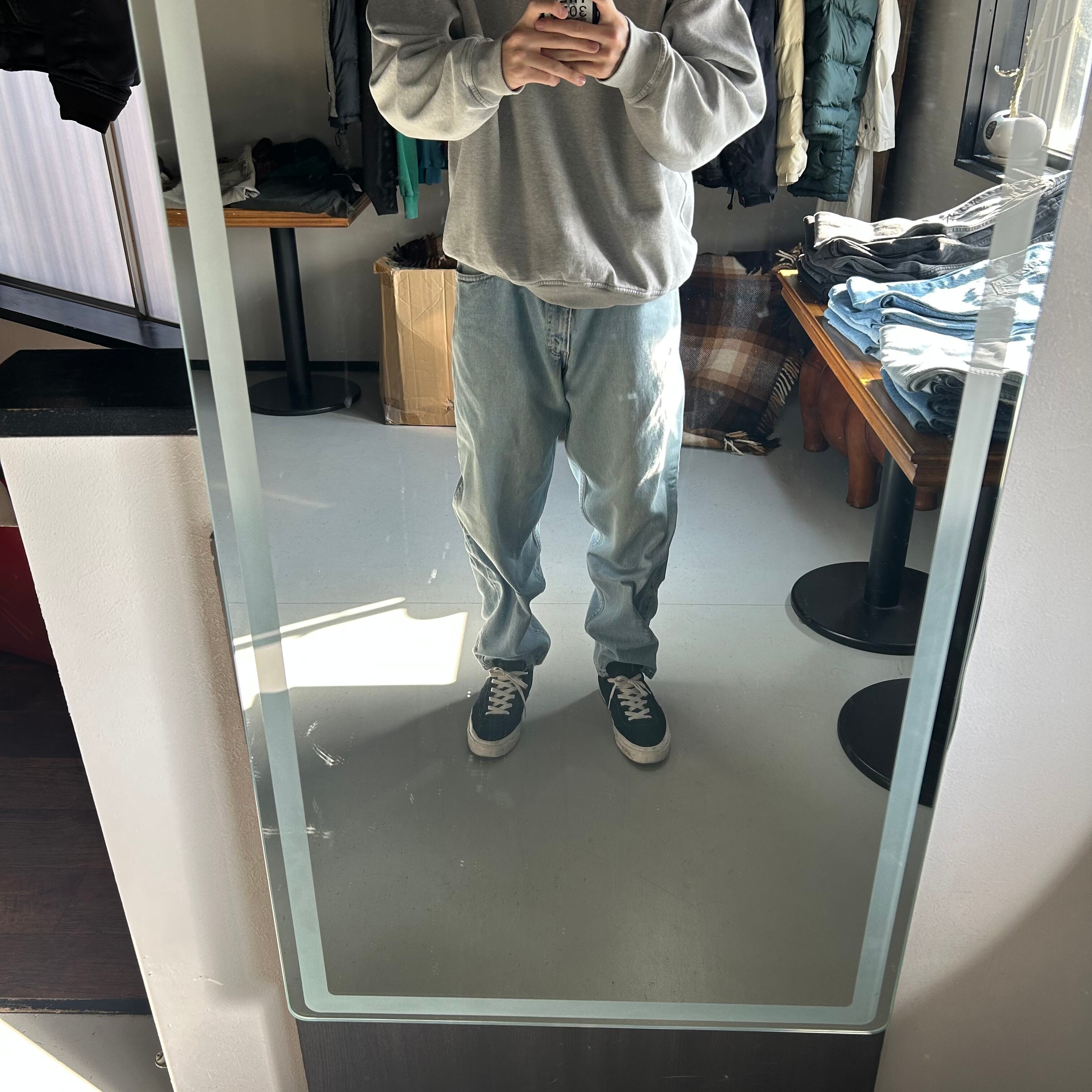 テーパードのお陰で太もも周りは太いですが、ダボダボ過ぎず程よい太さになっています。