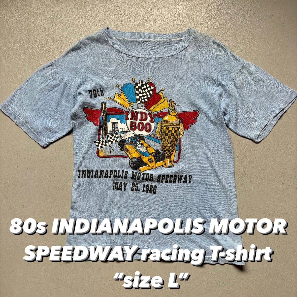 80s INDIANAPOLIS MOTOR SPEEDWAY racing T-shirt “size L” 80年代 インディアナポリス500 モータースピードウェイ レーシング 半袖 Tシャツ Tee 水色ボディ
